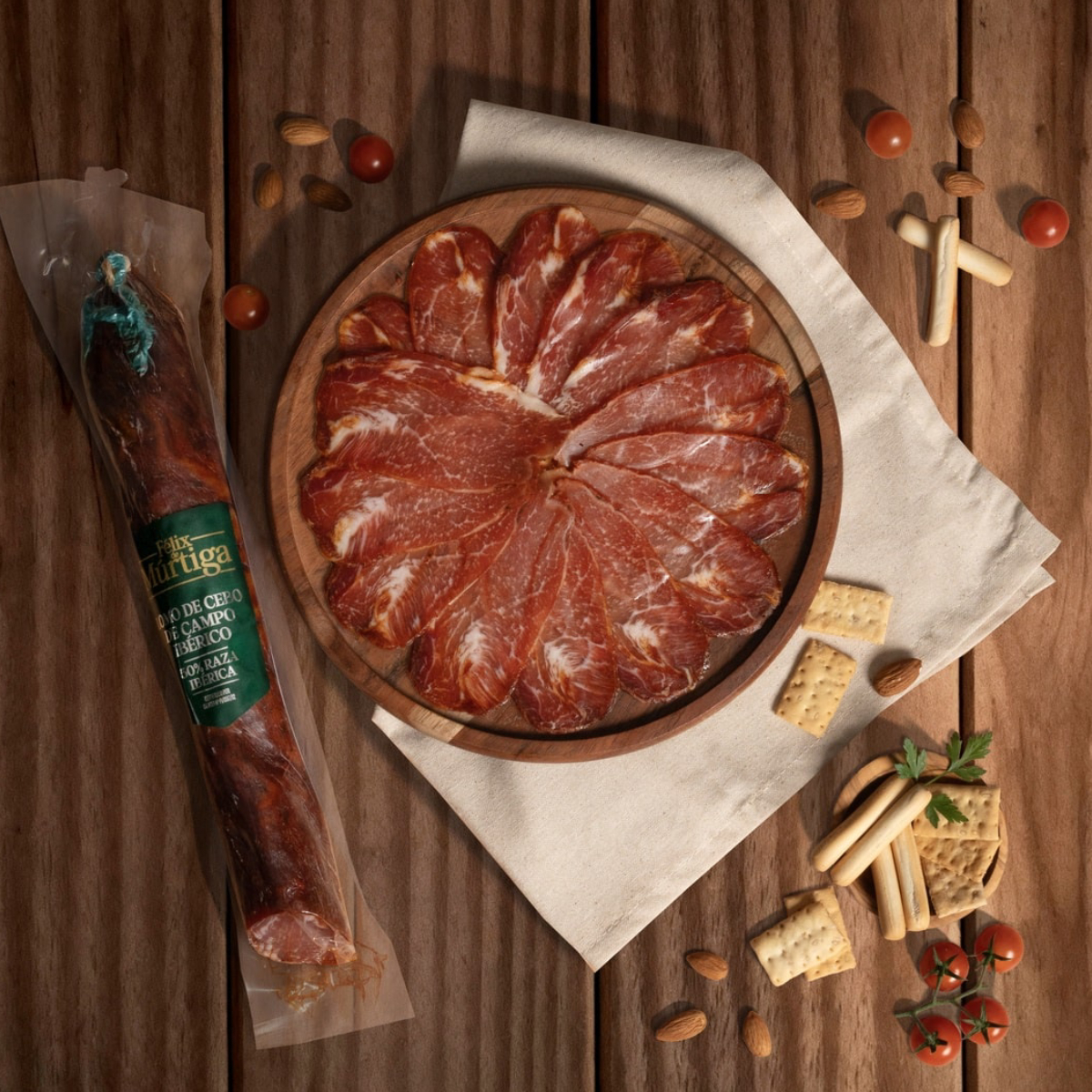 - INGREDIENTES: Lomo de cerdo de cebo de campo ibérico, sal, especias, azúcar, aceite de oliva, dextrosa, antioxidante (E-301) y conservadores (E-250 y E-252). Envoltura no comestible.
