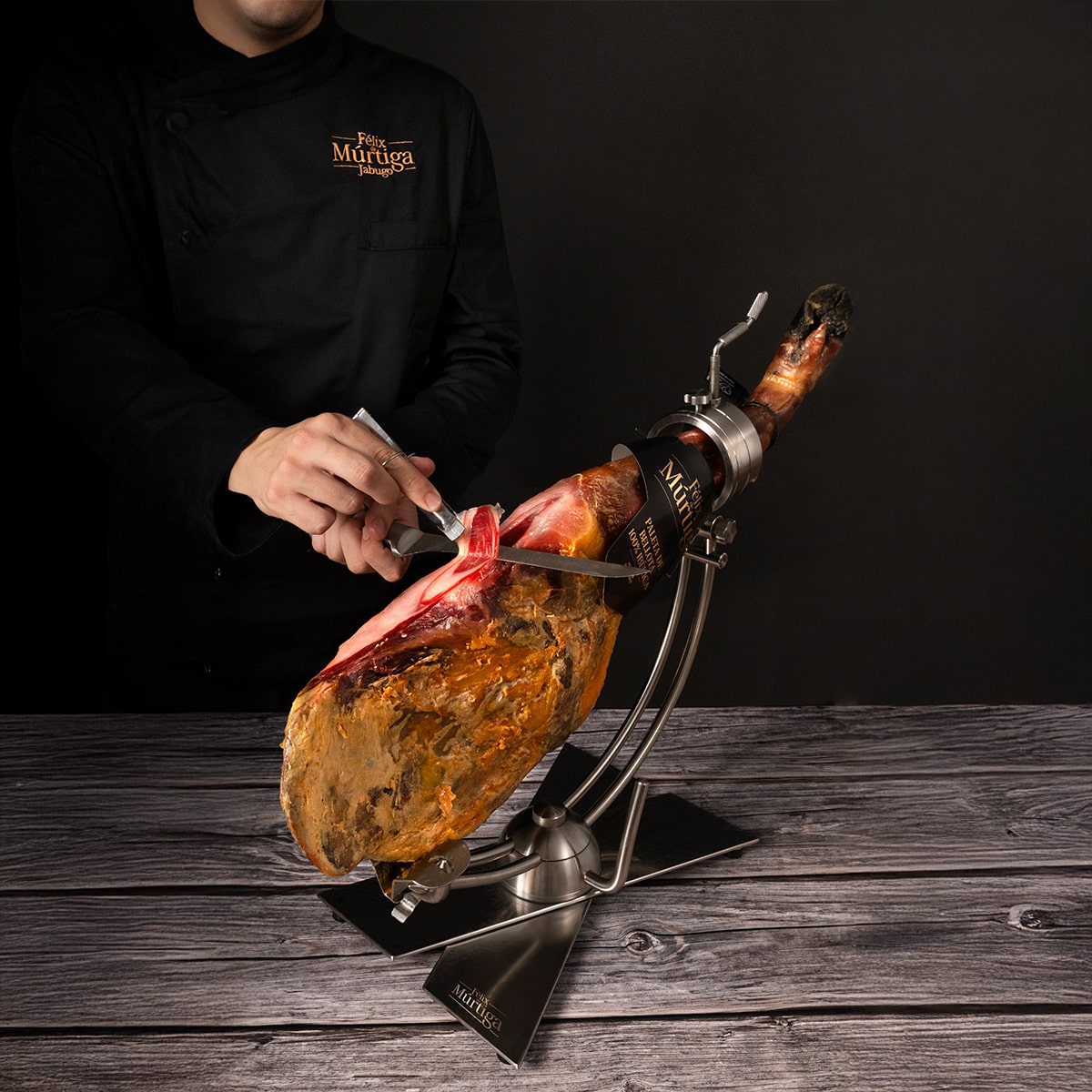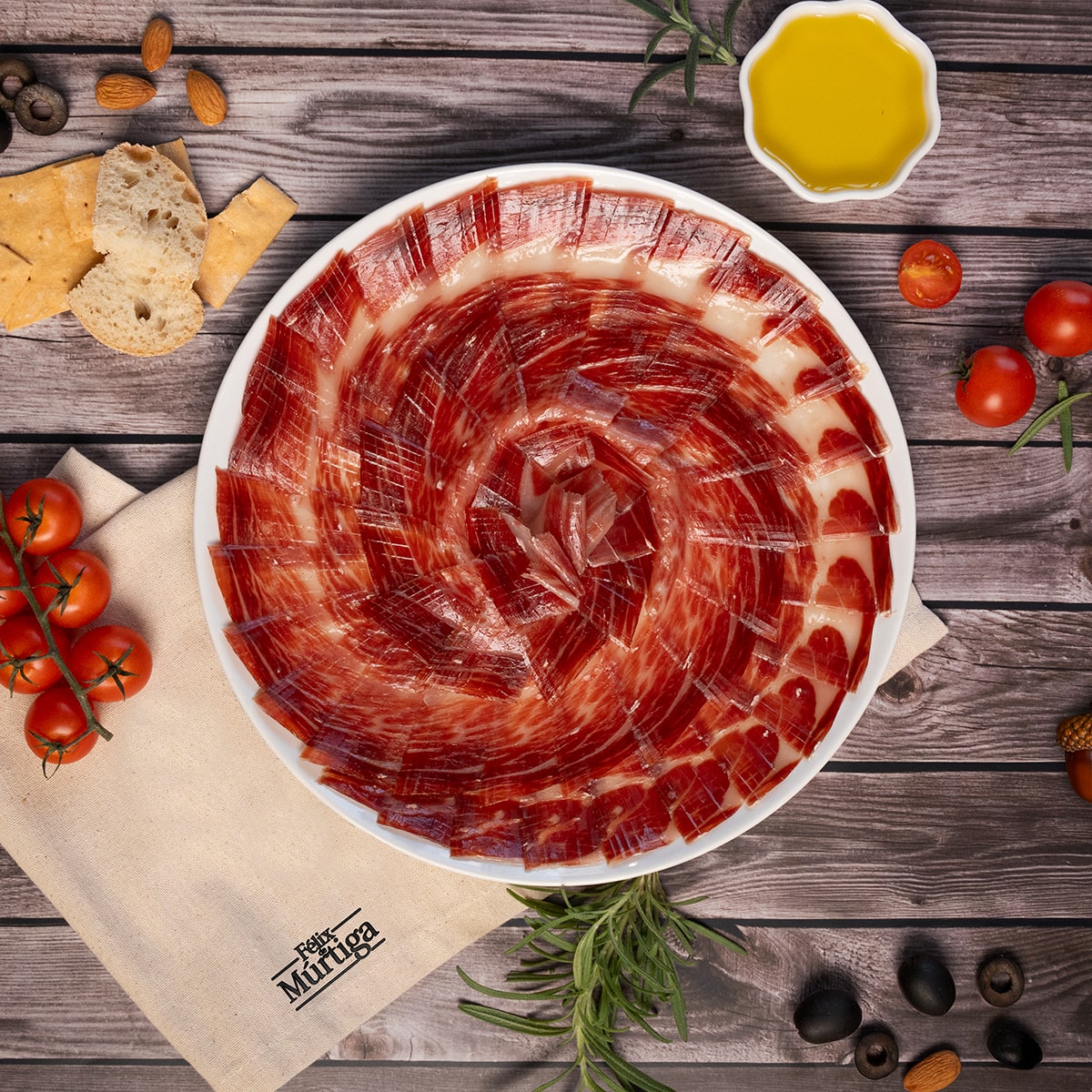 Déjate seducir por nuestra Paleta de Bellota 100% Ibérica. Su curación precisa y su textura delicada convierten cada loncha en un momento de auténtico disfrute.